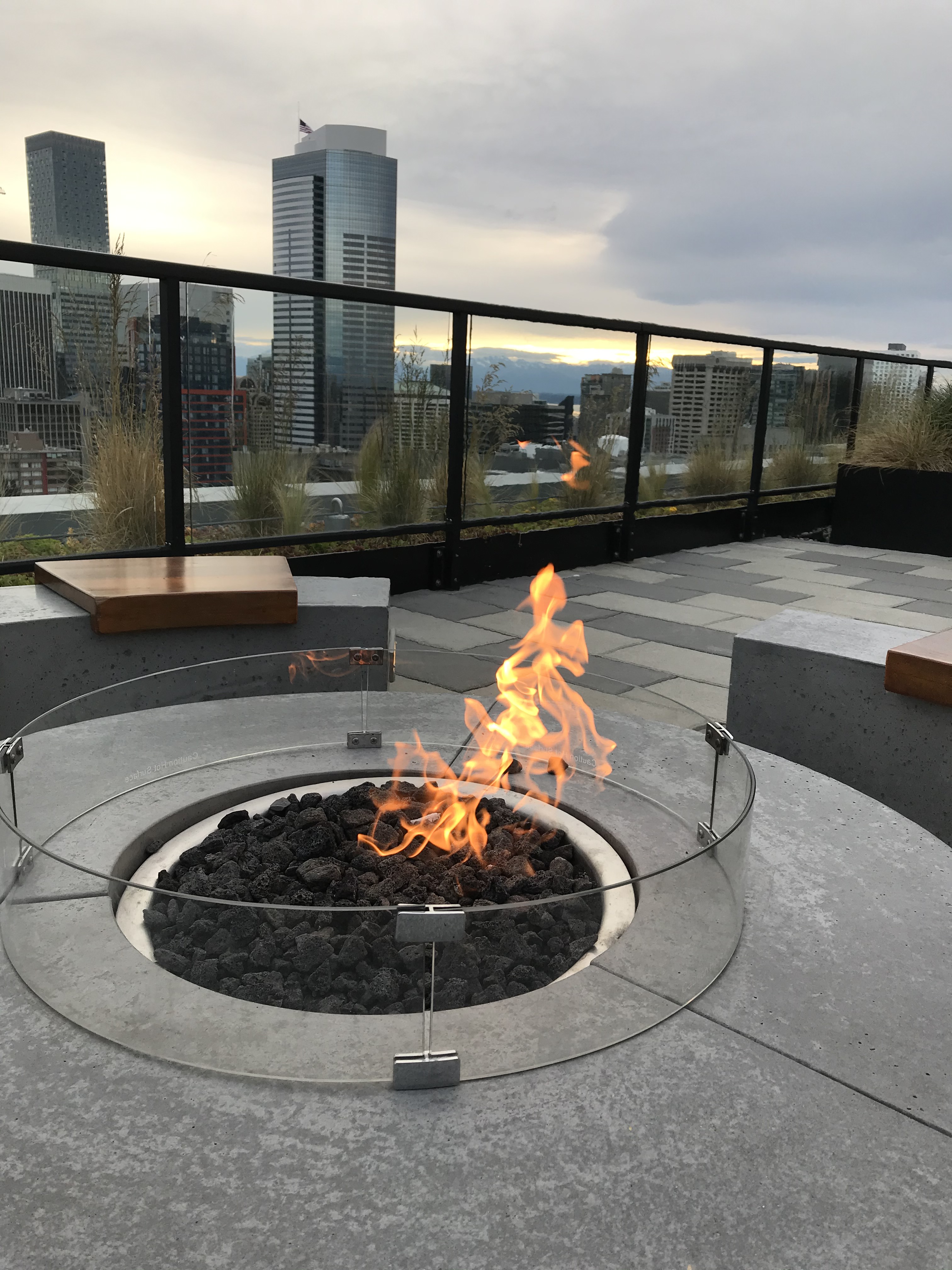Fire in circular fire pit on roof of tall building, other skyscrapers in the background.