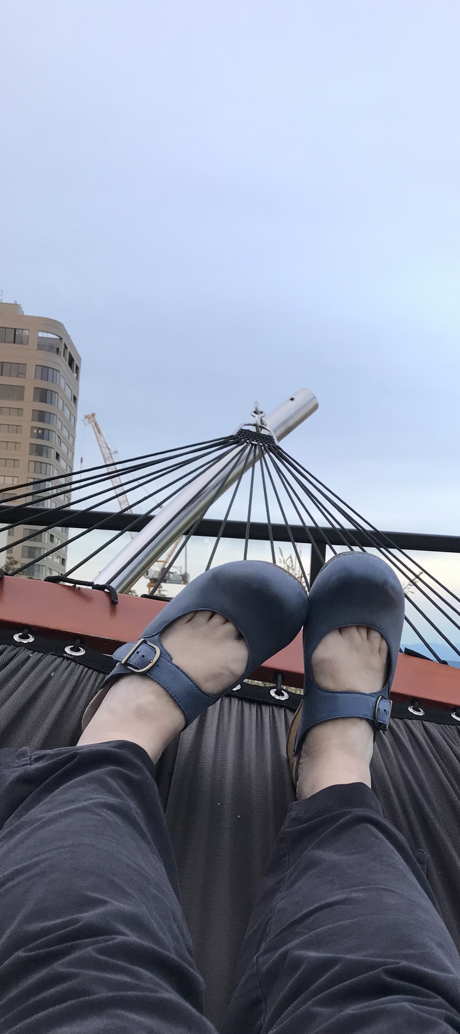 lower legs in pants, blue shoes resting on hammock, sky above and beyond.