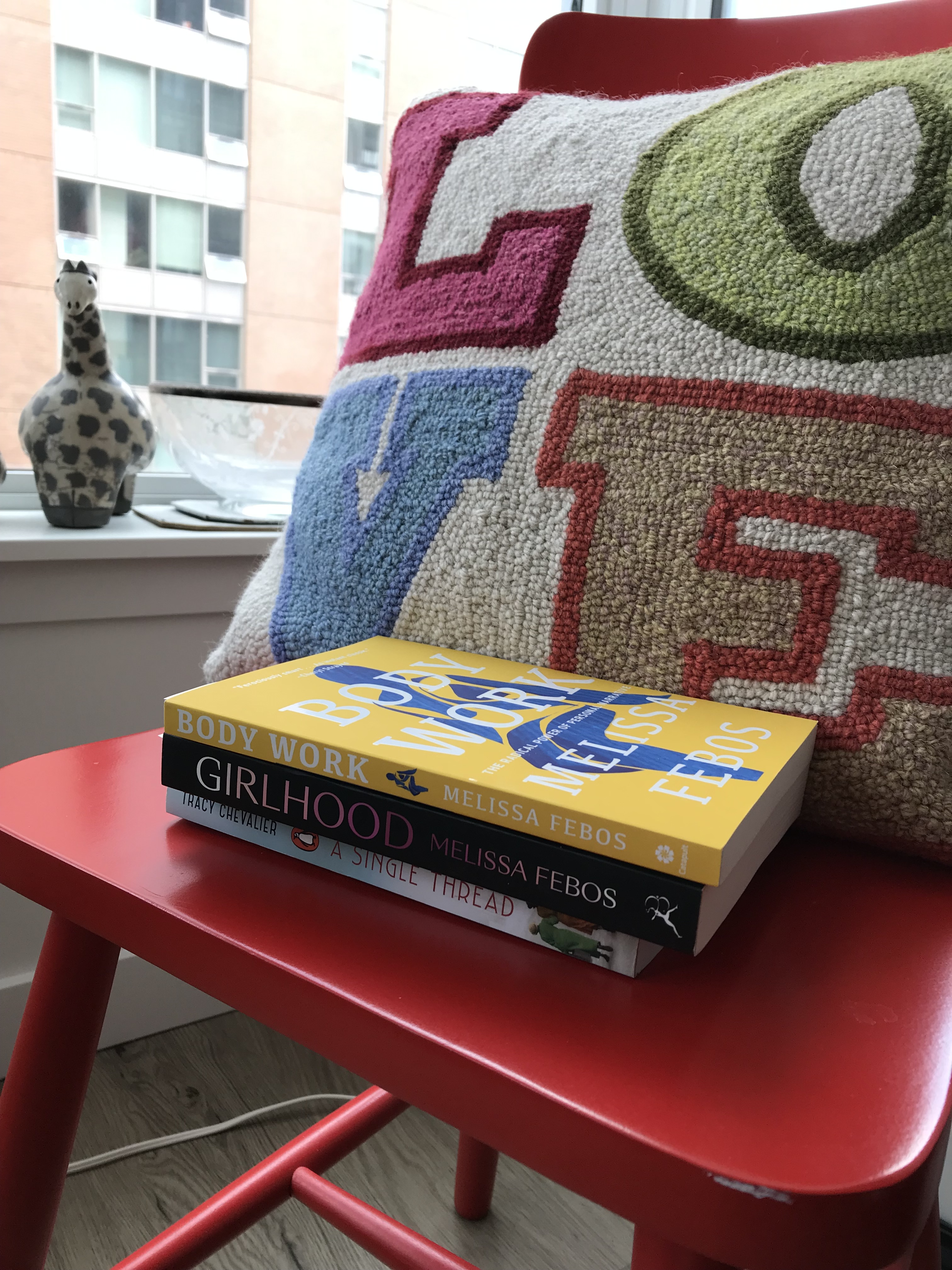 Stack of three books on a red chair with LOVE pillow behind them. Books: Body Work, Girlhood, and A Single Thread.