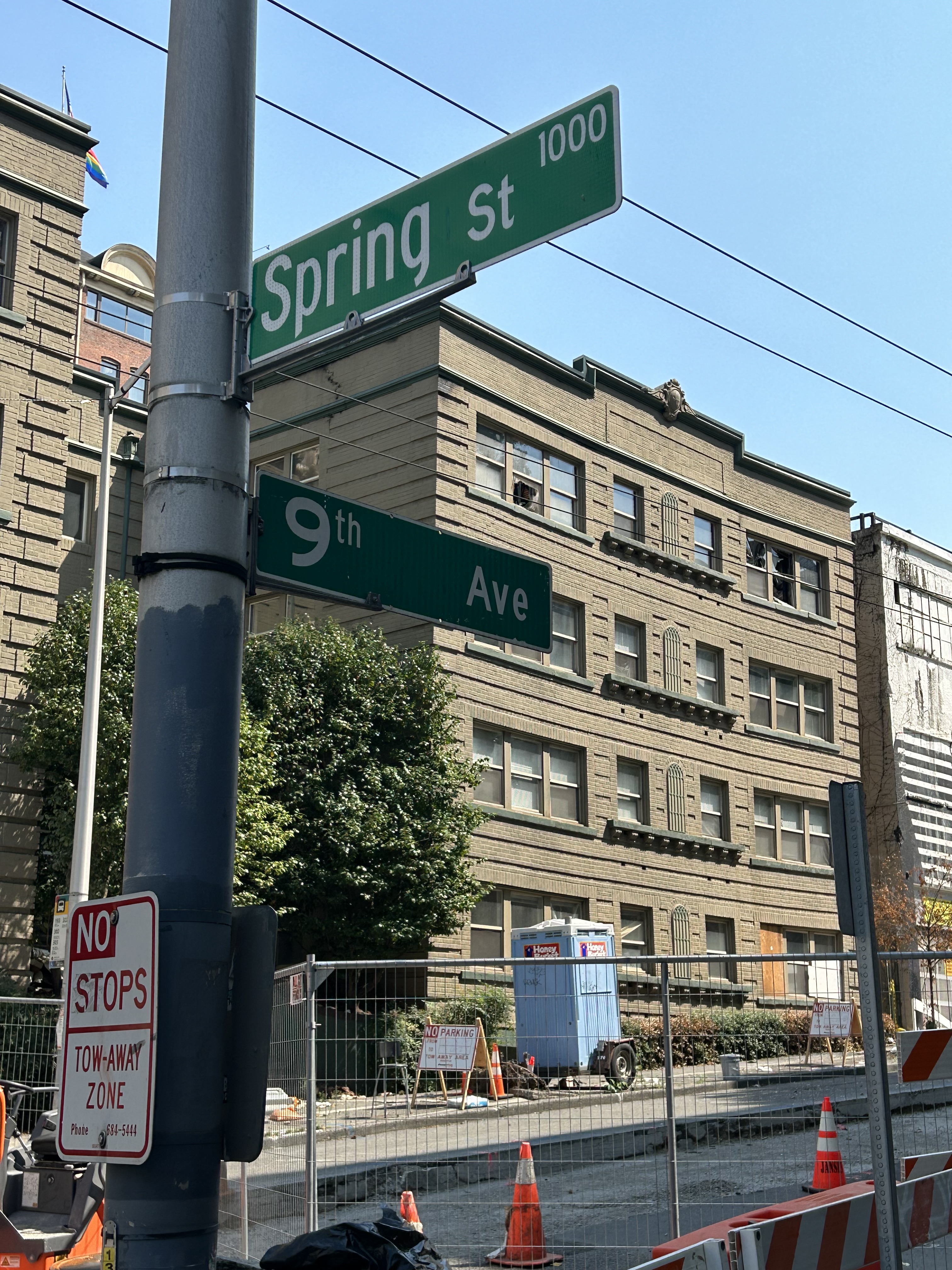 The building has been empty since everyone was paid to hustle out in the middle of the Pandemic because it was structurally unsound and wouldn’t have survived the Big One —no joke. We pass it now with some nostalgia. Initially, there were lights on and it seemed work was being done to repair it. We had hopes they wouldn’t tear it down, but then it got increasingly downtrodden with a broken window here, graffiti there. Eventually the management company took down its sign as if it wanted to dissociate itself with such a squalid looking place. Squatters moved in. Over the summer, there were two fires that started there, whether intentionally or accidentally is unclear. The second fire was large, burned a hole through the roof, and we can now see that not only is the roof gone but also the back wall. There’s a security fence around it and the sidewalk is closed. It’s unlikely we’d have moved back if they’d fixed it up, but still, it’s the end of an era, or, several eras for the building itself.