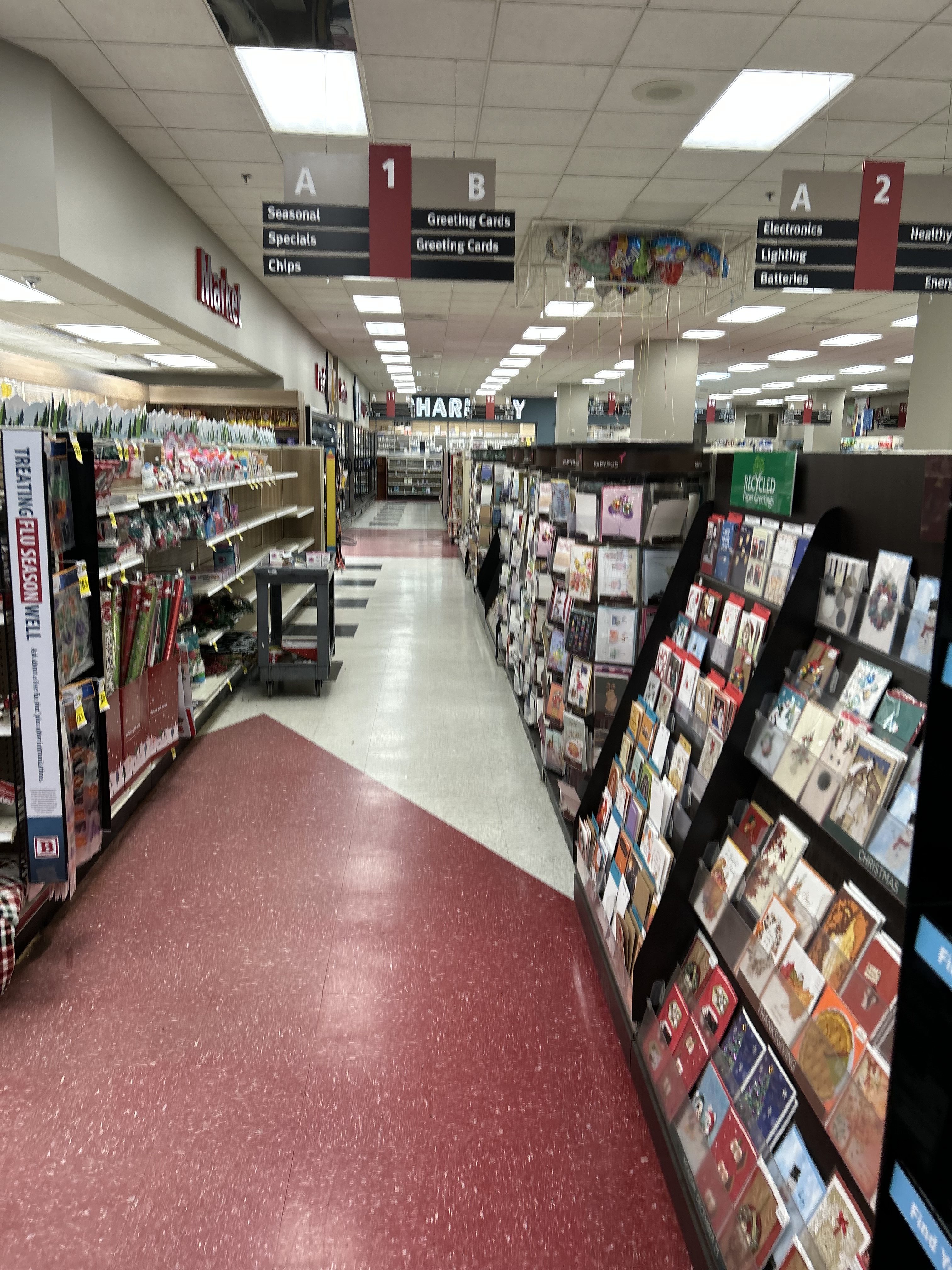 Interior of Bartell Drugs. Greeting cards and seasonal decor.